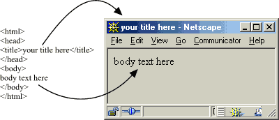 <HTML>With these two tags you indicate the file is a HTML file. You tell your browser: here the HTML file starts (<HTML>), and here it ends (</HTML>). These tags are to be used only once on a page. Before the <HTML> and after the </HTML> tag normally there is no text. <HTML>Head Every HTML file has a HEAD. This is also indicated with a set of two tags. These too only appear once on a page. The HEAD is put directly after the opening HTML tag. The main thing you put in the HEAD is the title of your page. The text between the TITLE tags is displayed in the title bar at the top of your browser window. Do not use any other tags inside the HEAD tags. You can only use some special tags there, which are beyond the scope of this tutorial. <HTML>Title Be sure to give your page a clear title. When visitors visit your page and bookmark it, this is the only visible thing their browser will remember. The title is also important to search engines. The title itself only consists out of plain text. You cannot use any other tags here. The TITLE tags also appear only once on your page, and are always put inside the HEAD tags. <HTML>Body Every HTML file has a body, denoted with the BODY tag. Between these tags you put the actual contents of your page. What will be visible in your browser window. It is getting pretty monotonous, the BODY tags are used only once on every page. The<BODY> tag is put immediately behind </HEAD > tag; the </BODY> tag is the last thing before the closing </HTML> tag. <HTML>